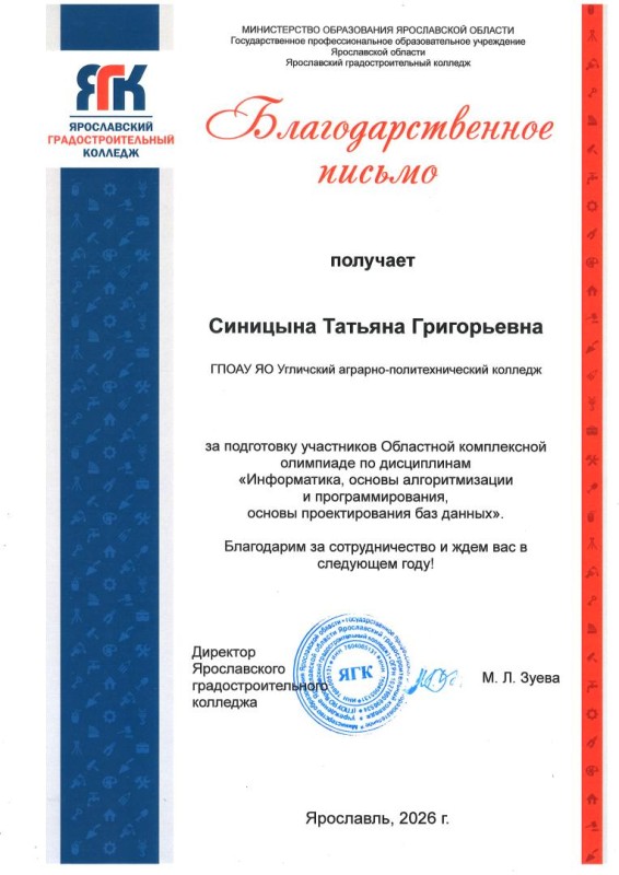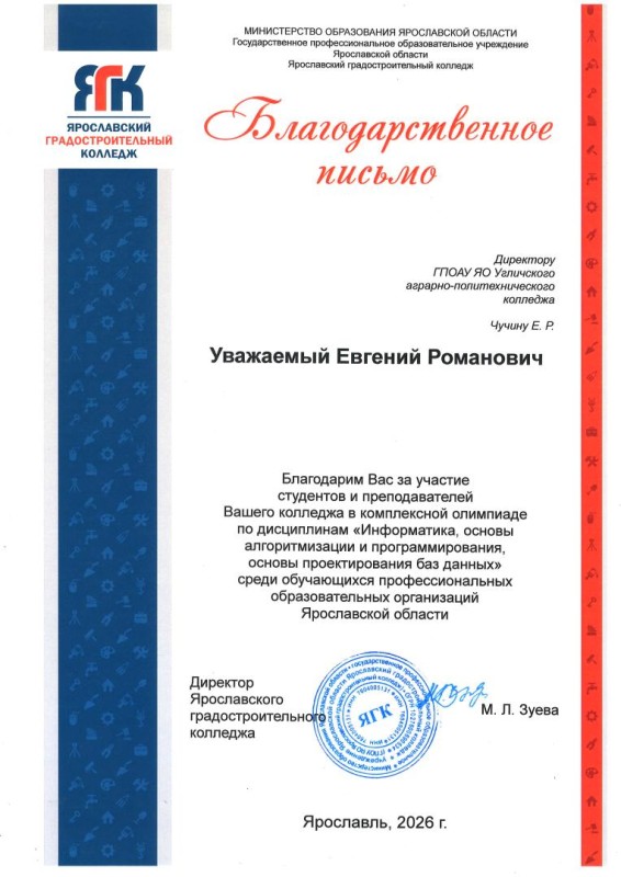 Министерство образования Ярославской области ГПОАУ ЯО Угличский аграрно-политехнический колледж